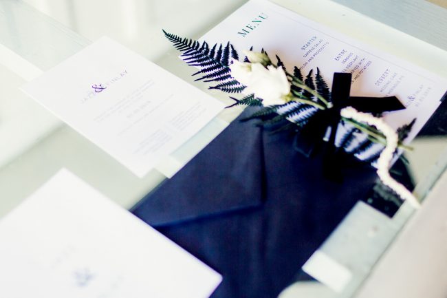 El minimalismo, presente en la decoración de las mesas del banquete, reina mediante la sensillez de flores únicas como Lisianthus, Gypsophila paniculata, Ranunculus y helechos negros.