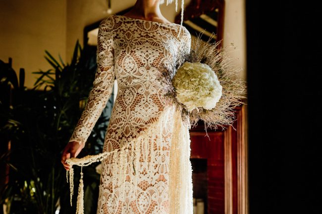 Sergi González ha diseñado unos bouquets completamente singulares, donde la pureza de los Dianthus blancos contrasta con la ramificación de materiales secos y la caída del Amaranthus blanco. Así como helechos tintados en negro que ofrecen gran volumen y textura en contraposición a la rosa de gran tamaño, situada en el centro. Se observa también la sencillez del Cymbidium con largos lazos de cinta aterciopelada.