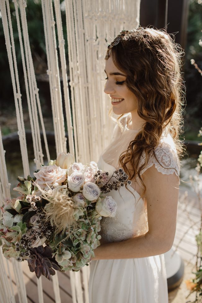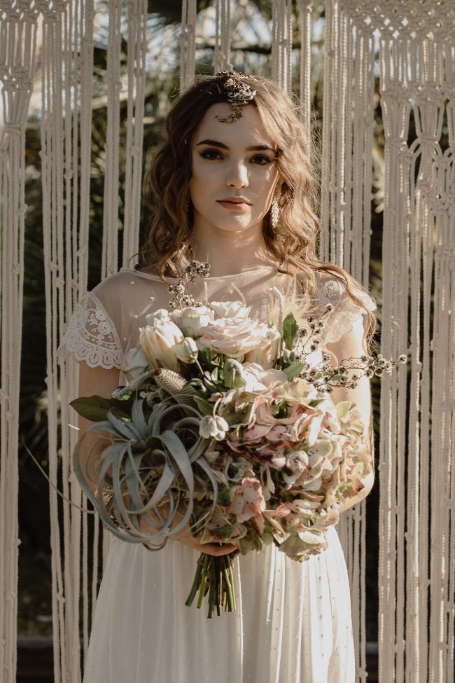 El ramo de novia se diseñó con flores: rosas, hortensias, Proteas, Helleborus así como plantas atípicas como la llamada Tillandia Xerographyca , aportando en su conjunto al bouquet, de un gran volumen y delicia de texturas.