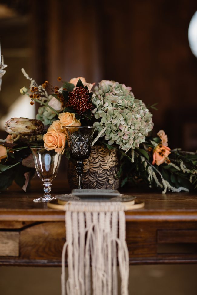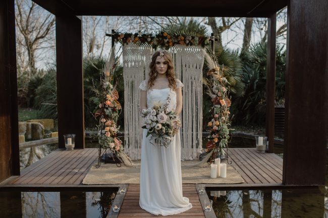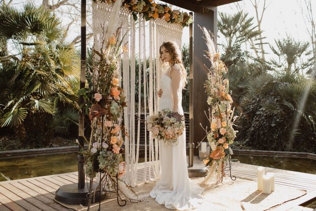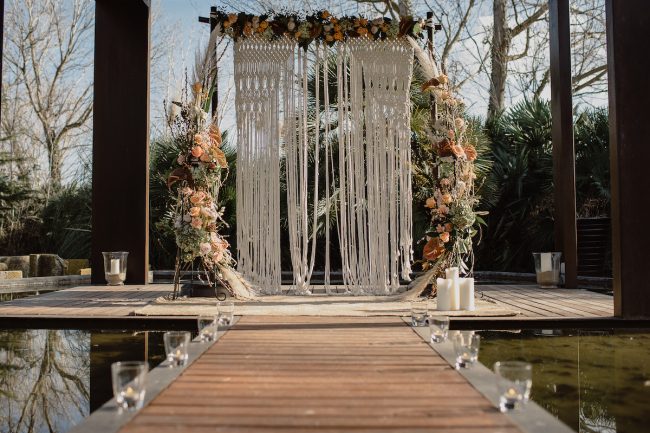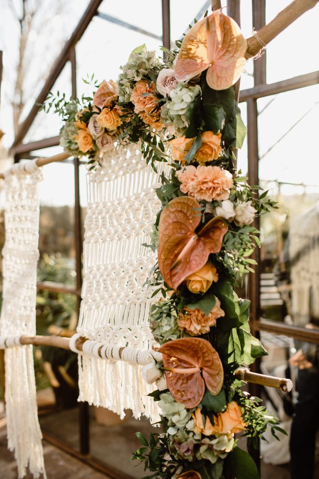 Para la ceremonia se instaló un hermoso arco floral formado por Anthurium, rosas, Hydrangea, Dianthus, Setaria, Cortaderia selloana, Skimmia japonica, Amaranthus, Protea, entre otros…acomapañados por el macramé y la estructura de madera natural.